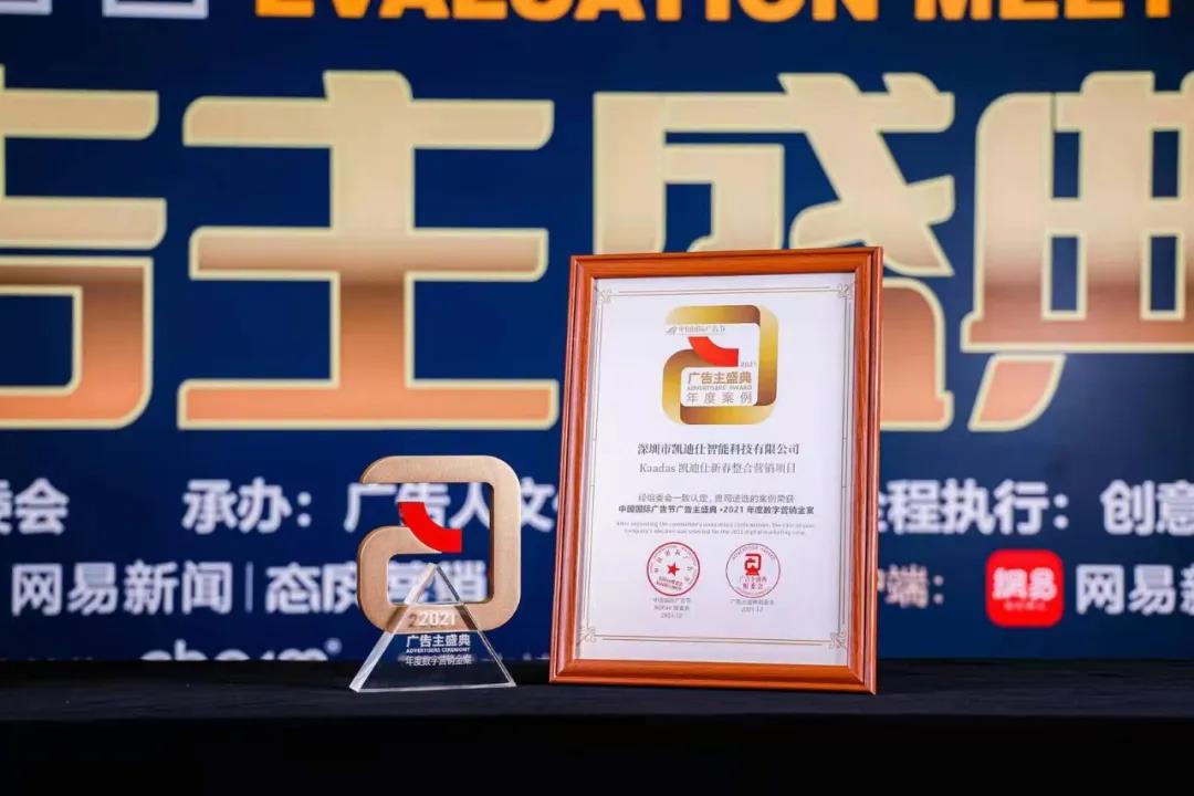 2021年(nian)12月11日(ri)-13日(ri),由中(zhong)國(guo)廣(guang)告協會主(zhu)辦(bàn)、廣(guang)告人(ren)文(wén)化集(ji)團(tuán)承(cheng)辦(bàn)的(de)第28屆中(zhong)國(guo)國(guo)際(ji)廣(guang)告節(jie)在(zai)福建(jian)廈們(men)盛(sheng)大(da)舉行,同期舉辦(bàn)2021廣(guang)告主(zhu)盛(sheng)典等(deng)矚目(mu)盛(sheng)會。Kaadas凱迪仕與騰訊廣(guang)告、比亞迪、興業銀行、加(jia)多(duo)寶、娃哈哈、青島啤酒等(deng)知名(míng)齊(qi)業共同入選,連續5年(nian)勇奪中(zhong)國(guo)廣(guang)告界至高(gao)榮譽——廣(guang)告主(zhu)獎,獲“2021年(nian)度數(shu)字營(ying)銷案例”重(zhong)磅榮譽,智能(néng)鎖行業唯一(yi)獲獎品(pin)牌!
