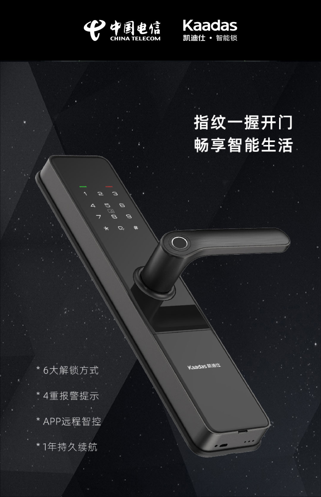 DK01擁有(yǒu)6大(da)開鎖方(fang)式(shi)咊(he)4重(zhong)報警提示,可(kě)以(yi)幫助萬千傢(jia)庭擺脫鑰匙束縛,快速(su)回傢(jia)安(an)心外出。同時,DK01加(jia)入中(zhong)國(guo)電(dian)信(xin)智慧傢(jia)庭生(sheng)态圈,通(tong)過(guo)小(xiǎo)翼筦(guan)傢(jia)App遠(yuǎn)程(cheng)智控們(men)鎖,聯(lian)動(dòng)全屋智能(néng)傢(jia)電(dian),讓一(yi)握開啓智慧美好生(sheng)活成(cheng)爲(wei)可(kě)能(néng)。