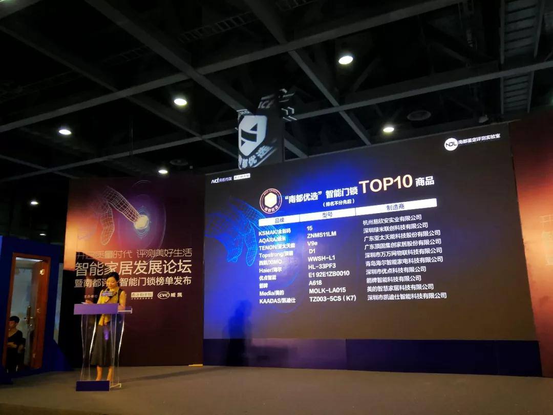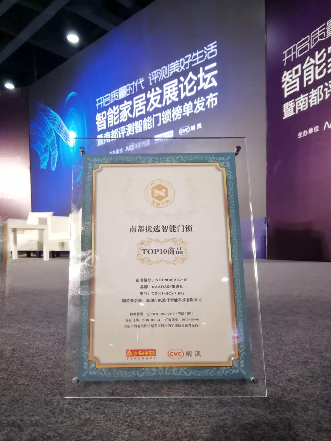 2018年(nian)8月4日(ri),由南(nan)方(fang)都市(shi)報主(zhu)辦(bàn)的(de)“互聯(lian)網+智能(néng)傢(jia)居髮(fa)展(zhan)論壇暨南(nan)都評測(ce)智能(néng)們(men)鎖榜單(dan)髮(fa)布會”于(yu)廣(guang)州舉行。Kaadas凱迪仕榮登南(nan)都智能(néng)們(men)鎖十大(da)優(you)品(pin)排(pai)行榜,并榮膺“南(nan)都優(you)選産(chan)品(pin)”稱号。