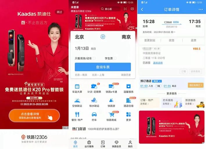 凱迪仕在(zai)App開屏、車(che)票預訂頁(yè)、